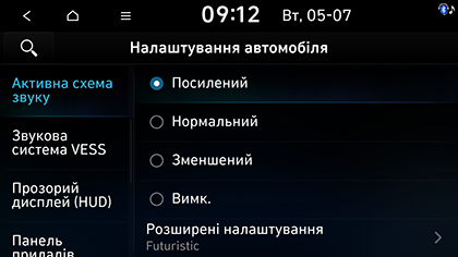 2. Виберіть потрібні елементи. Режим звуку двигуна можна встановити на Посилений, Нормальний, Зменшений або Вимк..