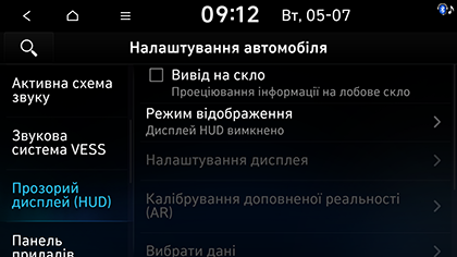 1. Натисніть SETUP > Автомобіль > Прозорий дисплей (HUD).