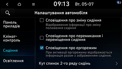 • Сповіщення про ергорежим: коли вмикається сидіння Ergo-motion, відображається зображення сидіння та інформація про роботу функції.