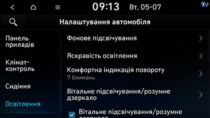 • Комфортна індикація повороту: вибір кількості разів блимання сигналу повороту, коли важіль переміщується злегка. Можна вибрати 7 блимань, 5 блимань, 3 блимання або Вимк..