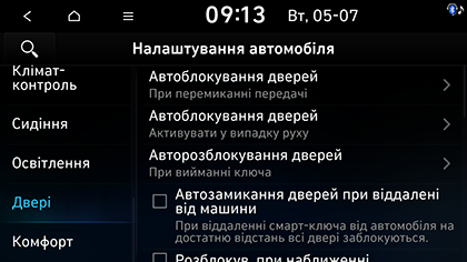 • Автоблокування дверей: налаштування умов для автоматичного блокування всіх дверей. Можна вибрати Активувати у випадку руху, При перемиканні передачі, Активувати при перемиканні передачі на R, N або D або Вимк..