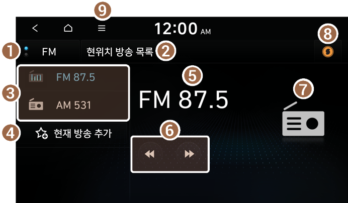 라디오 화면은 방송 청취 중에 실행할 수 있는 다양한 기능들로 구성되어 있습니다.