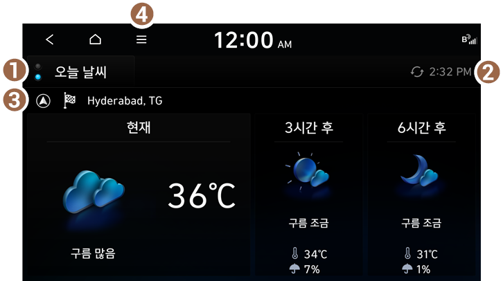 전체 메뉴 화면에서 블루링크 ▶ 날씨를 누르세요.