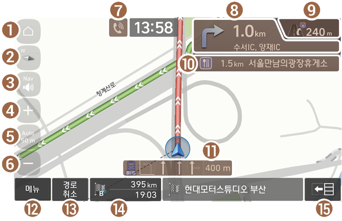 길 안내 화면에서 사용할 수 있는 기능과 표시되는 정보는 다음과 같습니다.