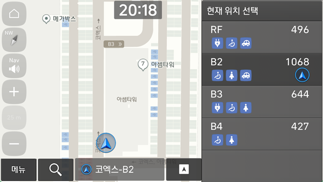 실내주차장 진입 시, 우측 화면에 차량의 현재 위치가 아이콘으로 표시됩니다. 다른 층을 선택하면 해당 층으로 차량의 위치가 변경되며 선택한 층의 지도 화면이 표시됩니다.