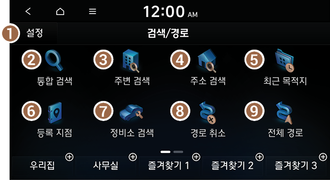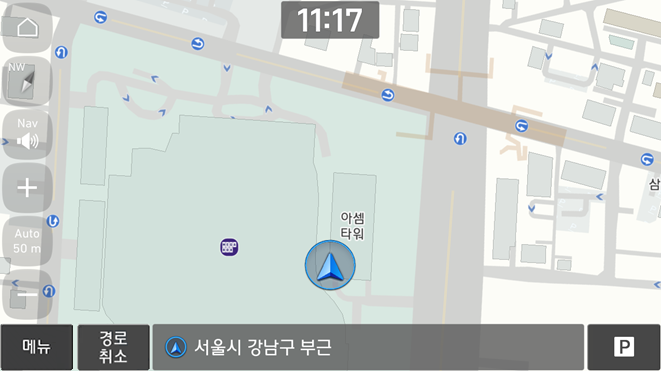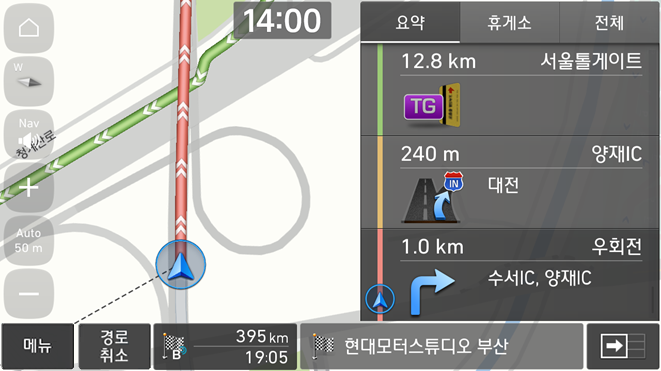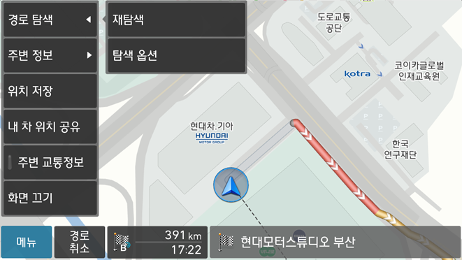 길 안내를 취소하려면 경로 취소를 누르거나 전체 메뉴 화면에서 검색/경로 ▶ 경로 취소를 누르세요.