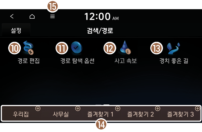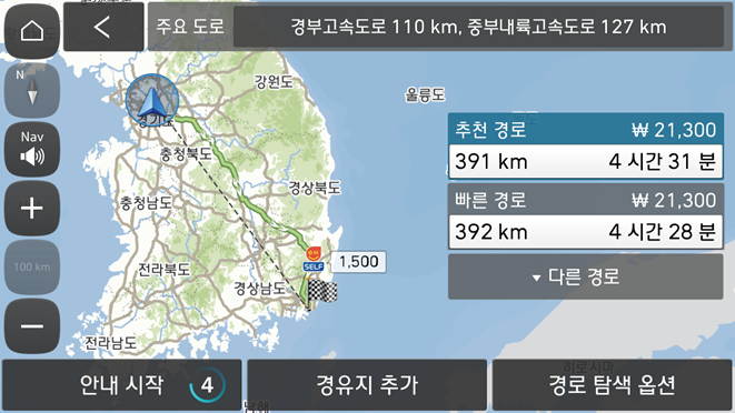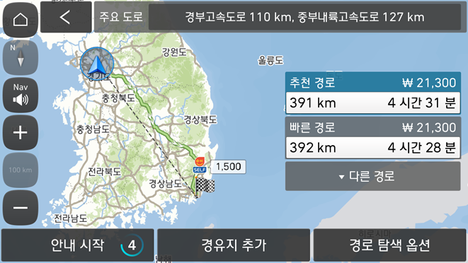 검색 경로 화면에서 제공하는 다양한 기능을 사용해 안전하고 편리하게 내비게이션 기능을 사용할 수 있습니다.