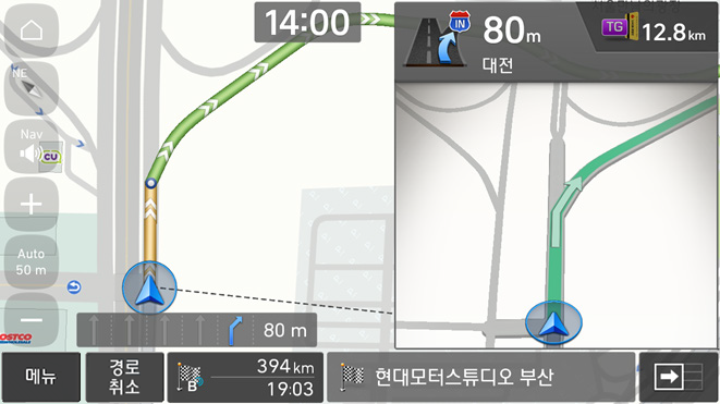 (주행 방향 3D): 주행 방향에 따라 지도 화면을 회전해서 입체적으로 볼 수 있습니다.주행 중 방향을 전환해야 할 때 또는 차선을 변경해야 할 때 확대도가 자동으로 표시됩니다.