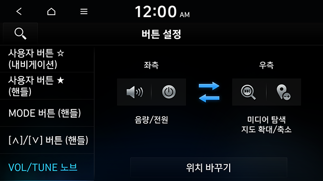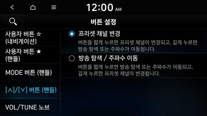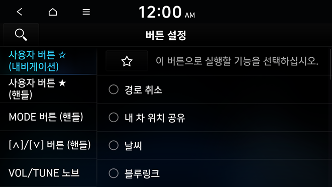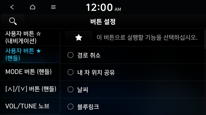 스티어링 휠의 사용자 버튼을 눌러 실행할 기능을 설정할 수 있습니다. 자주 사용하는 기능을 사용자 버튼 기능으로 설정하면 편리합니다