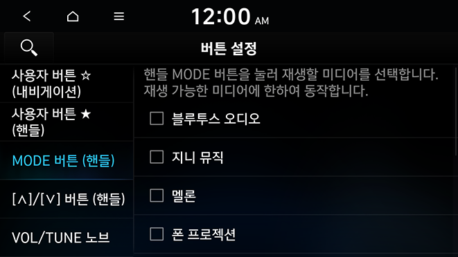 스티어링 휠에서 버튼을 눌러 실행할 미디어 모드를 선택할 수 있습니다.