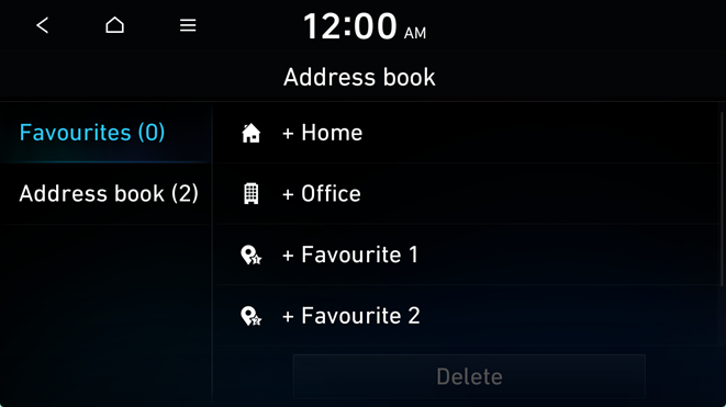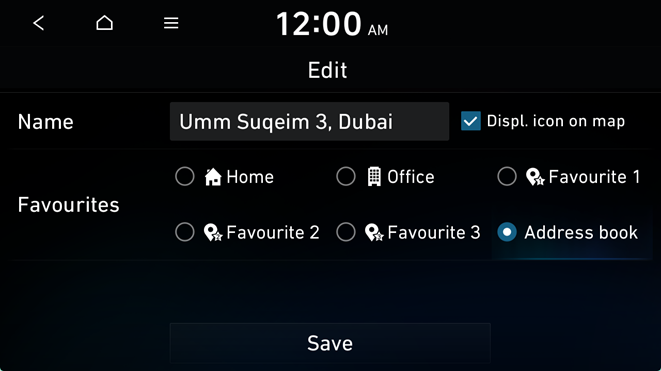 The selected place is saved as a favourite and displayed as a shortcut button at the bottom of the Navigation screen.