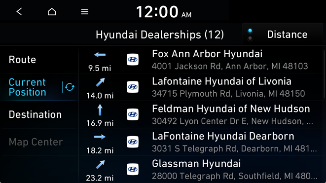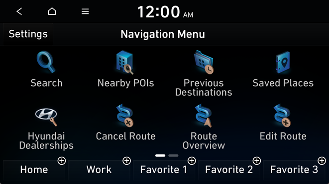 On the Navigation menu, you can set the destination by using various searches, such as entering the location information or selecting from recent destinations or categorized places.