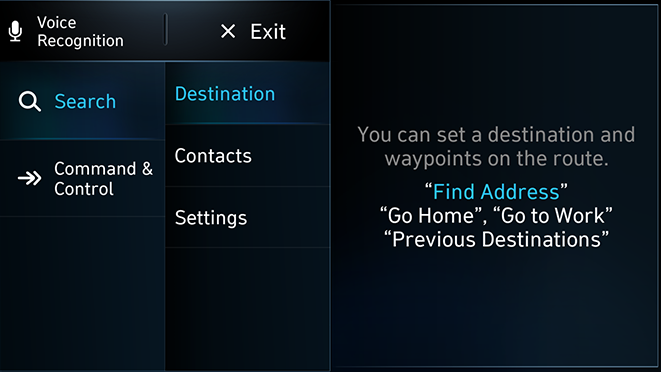 Navigation commands | Run navigation, and set a destination or waypoints. | Find <POI> Go Home/Go to Work Reroute |