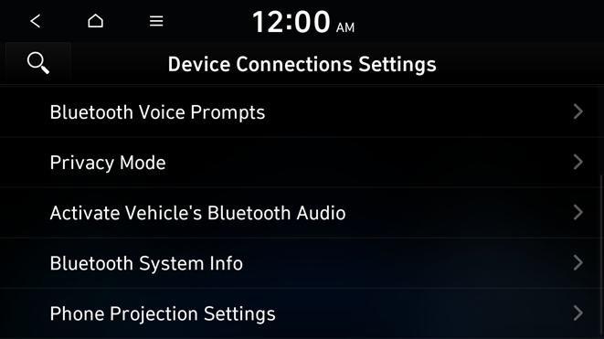 You can manage Bluetooth devices or configure their operation settings. You can also activate the phone projection so that you can control the smartphone Apps on the system screen after connecting the smartphone to the system.