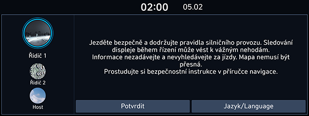 - Stiskněte tlačítko startu motoru nebo nastavte klíč zapalování do polohy On (Zapnuto) nebo ACC. Jakmile je systém zapnutý, spustí se proces spouštění a zobrazí se obrazovka s bezpečnostním varováním.