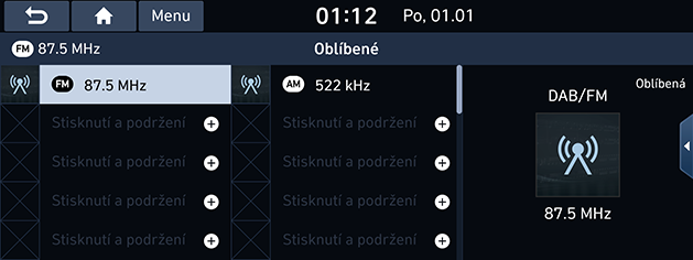 Na displeji se zobrazí DAB (Je-li součástí vybavení)/FM obrazovka naposledy poslouchaných stanic.