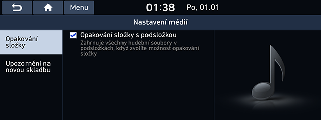 - [Opakování složky]: Zaškrtnete-li tuto možnost, budou při volbě opakování složky zahrnuty všechny hudební soubory v podsložkách.