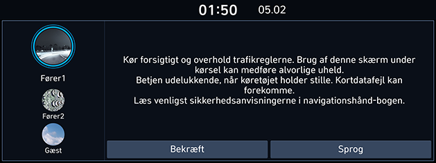- Tryk på motorens startknap eller indstil tændingsnøglen til On eller ACC On. Når systemet tændes vil opstarts-processen starte, og sikkerhedsadvarslen vises.