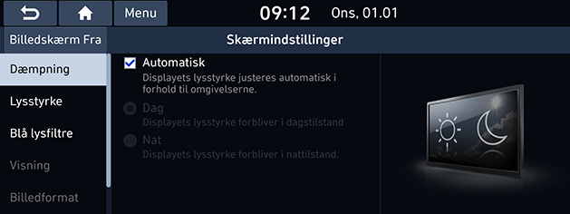 - Night: Hvis du vil indstille [Dæmpning] til nat, skal du indstille niveauet for displaybelysning til nattilstand.