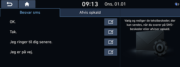 - Du kan vælge den ønskede besked i [Besvar sms] eller [Afvis opkald].