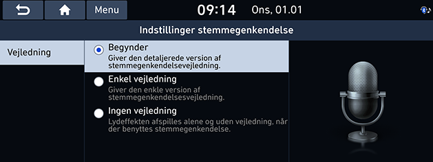 - [Vejledning] > [Begynder]: Systemet giver detaljerede instruktioner til stemmegenkendelse.