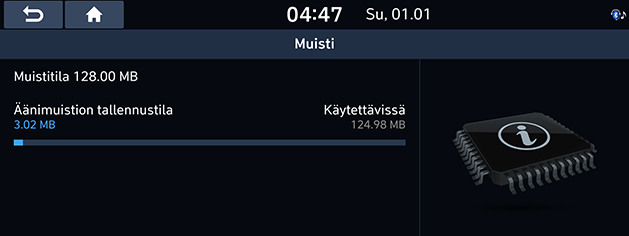 Voit tarkistaa äänitallennuksen muistitilan (Kokonaismuisti, käytetty muistitila, jäljellä oleva muistitila).