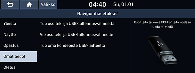 - [Tuo oma kohdepiste USB-laitteelta]: Tällä toiminnolla voi siirtää USB-muistilaitteeseen tallennettuja POI-tietoja, kuten karttatietoja (esimerkiksi sijainti tai nimi).