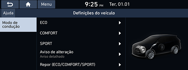 - [Repor (ECO/NORMAL/SPORT)]/[Repor (ECO/COMFORT/SPORT)]: Repõe as definições originais do modo de condução.