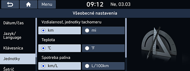Toto menu sa používa na nastavenie jednotiek zobrazených v systéme.