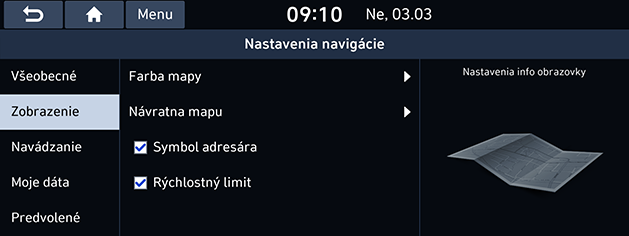 - [Rýchlostný limit]: Nastaví, či sa má alebo nemá zobrazovať obmedzenie rýchlosti.