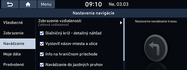 - [Navádzanie do jazdných pruhov]: Nastaví zapnutie/vypnutie navádzania do jazdných pruhov.