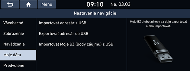 - [Importovať Moje BZ (Body záujmu) z USB]: Táto funkcia slúži na import údajov o bodoch záujmu POI vrátane informácií o mape (pozícia, meno atď.), ktoré sú uložené na pamäťovom USB zariadení.
