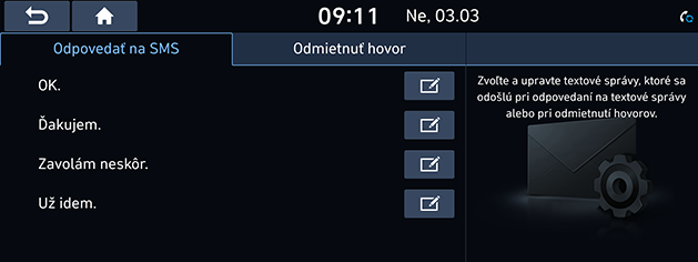 - Požadovanú správu môžete vybrať v položke [Odpovedať SMS správou] alebo [Odmietnuť hovor].