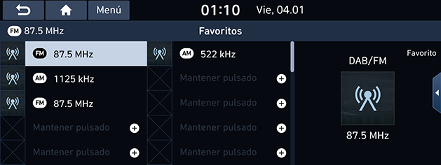 Se muestra la pantalla DAB (Si está equipado)/FM de la última emisora escuchada.