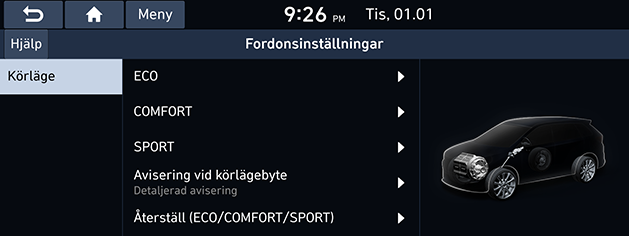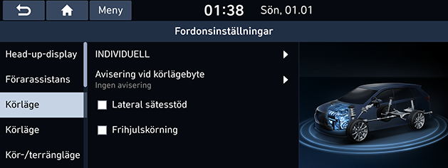 - Tryck på [SETUP] > [Fordon] > [Körläge].