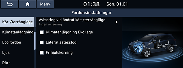 Den här menyn beskriver fordonsinställningar. Vissa funktioner kan skilja sig från den faktiska produkten beroende på modell, alternativ och land.