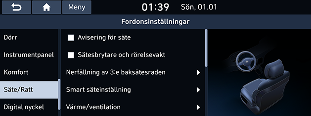 - Tryck på [SETUP] > [Fordon] > [Säte/Ratt].