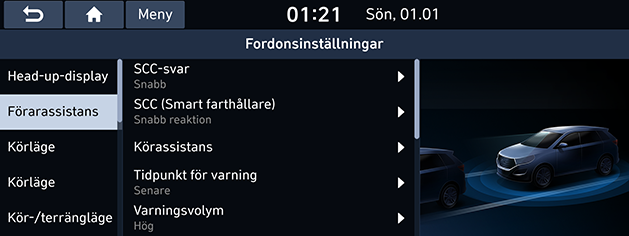 - Tryck på [SETUP] > [Fordon] > [Förarassistans].