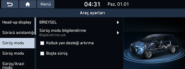 - [SETUP] > [Araç] > [Sürüş modu] sekmelerine basın.