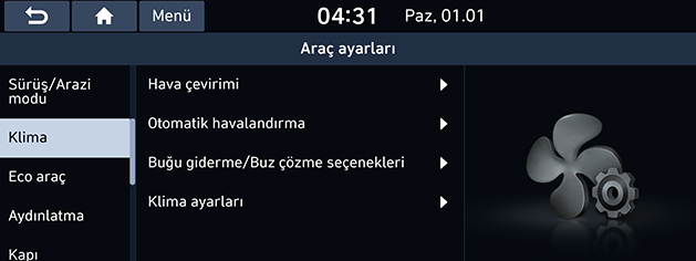 - [SETUP] > [Araç] > [Klima] sekmelerine basın.