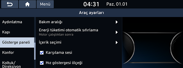 - [SETUP] > [Araç] > [Gösterge paneli] sekmelerine basınız.