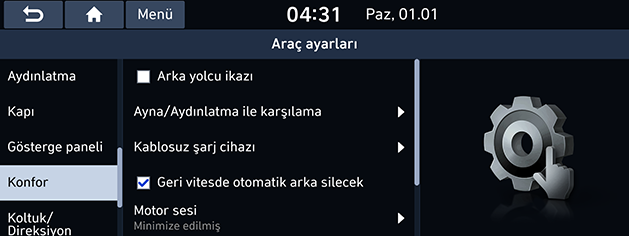 - [SETUP] > [Araç] > [Konfor] sekmelerine basınız.