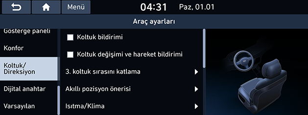 - [Koltuk/Direksiyon]: Koltuk ve direksiyon simidi ayarlarını değiştirir.
