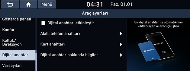 - [SETUP] > [Araç] > [Dijital anahtar] sekmelerine basın.