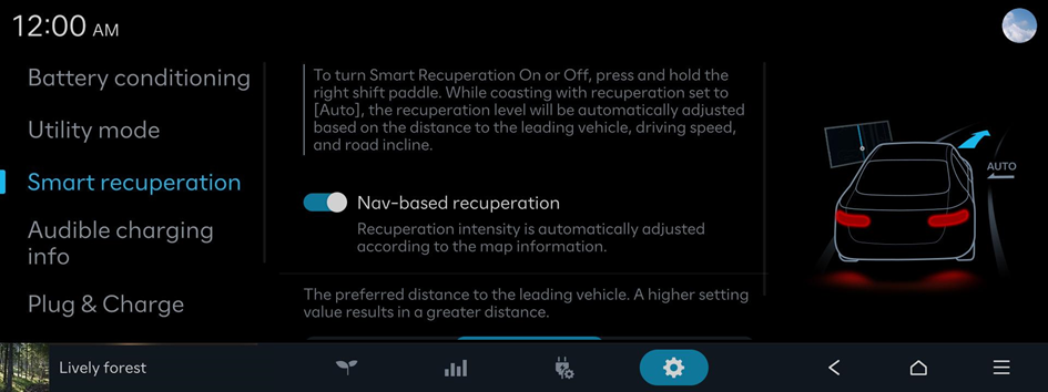 While coasting with recuperation set to [Auto], the recuperation level will be automatically adjusted based on the distance to the leading vehicle, driving speed, and road incline.