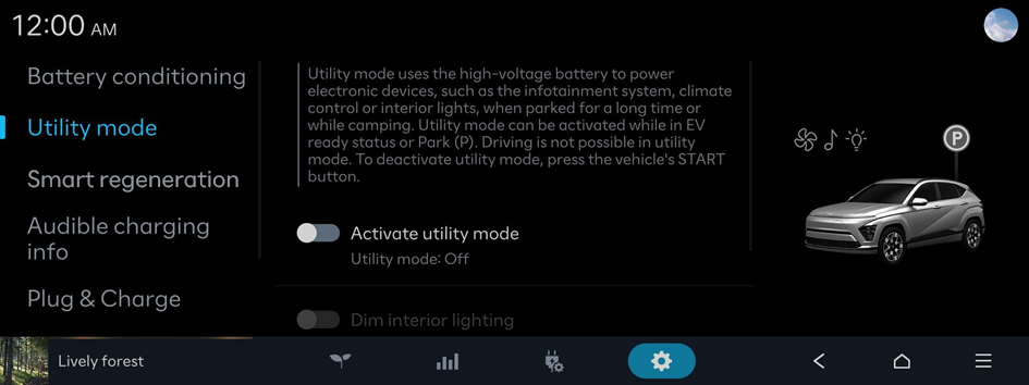 Utility mode uses the high-voltage battery to power electronic devices, such as the infotainment system, climate control or interior lights, when parked for a long time or while camping.