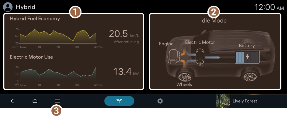 1. View the average fuel economy and electric motor usage of the vehicle.