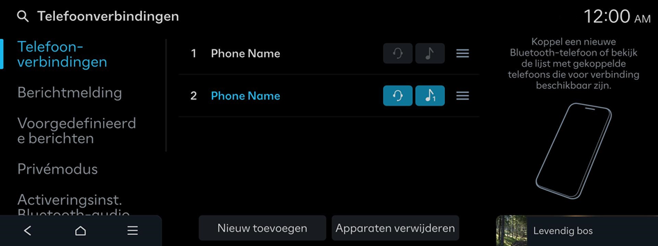Bluetooth-apparaten beheren of hun bedieningsinstellingen configureren. U kunt ook de telefoonprojectie activeren, zodat u de smartphone-app vanaf het systeemscherm kunt bedienen, nadat u de smartphone met het systeem hebt verbonden.
