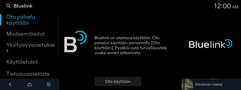 - Paina aloitusnäytössä Asetukset ▶ Bluelink ▶ Ota palvelu käyttöön.