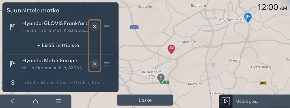 ▶ Reitti ▶ Suunnittele matka. - Paina reittiluettelossa poistettavan kohteen vieressä olevaa